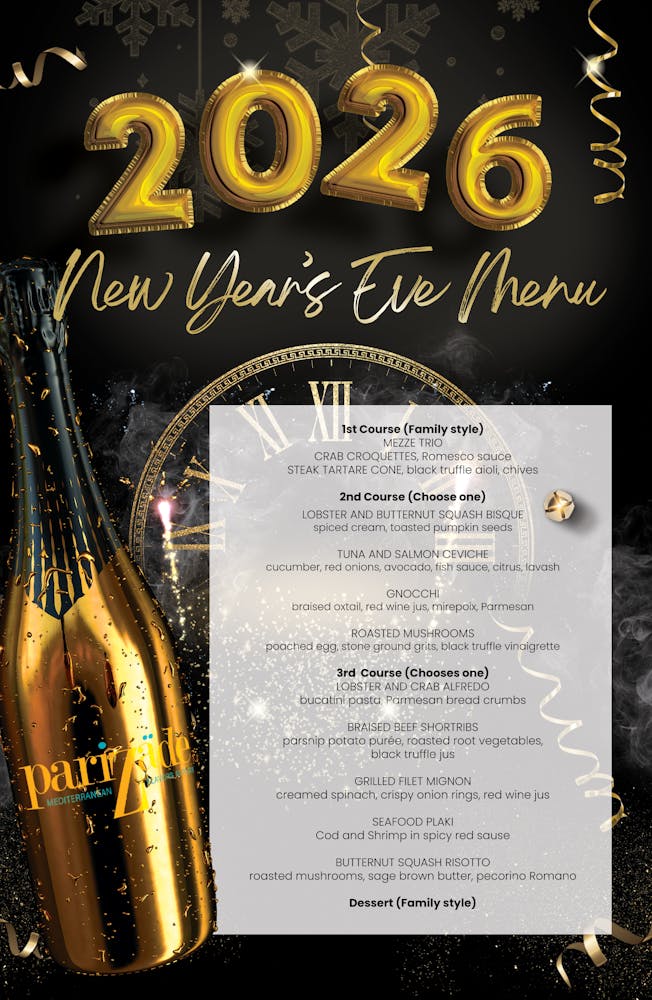 Come ring in 2026 at Parizade! Our annual New Year's Party is $130 per person and includes a four course menu, live music from The Retro Band, dancing, party favors, and a champagne toast at midnight. Seatings are available at 9:00, 9:15, and 9:30 and the party lasts until right after the ball drops. This event always sells out so reserve your seats today - cheers!
